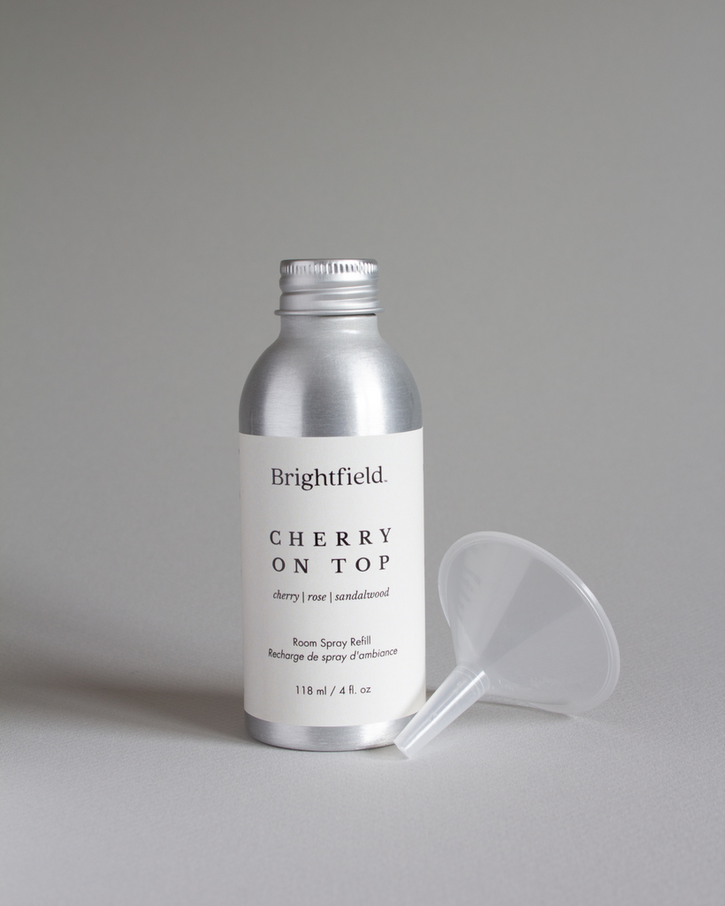 Our Cherry On Top Room Spray Refill Kit helps you easily refill our Cherry On Top Room Spray. Inspired by a picnic in a secret garden, this irresistible room spray has notes of ripe cherries, rose, almond, vanilla bean, and sandalwood.