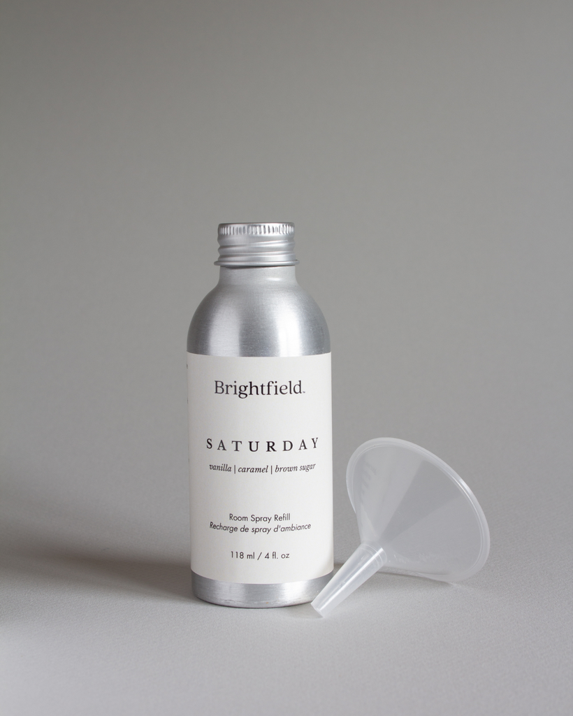 - Saturday Room Spray refill (4 oz) in a recyclable aluminium bottle